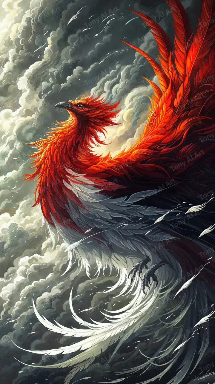 Hình nền phượng hoàng lửa AI art với hiệu ứng cánh rực rỡ, bối cảnh mây thần bí, tải miễn phí 4K chất lượng cao.