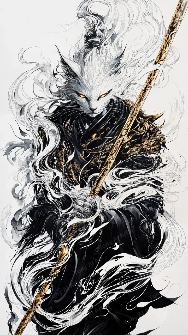 300 DPIMèo Chiến Sĩ Gậy Vàng - Hình Nền AI Art 4K