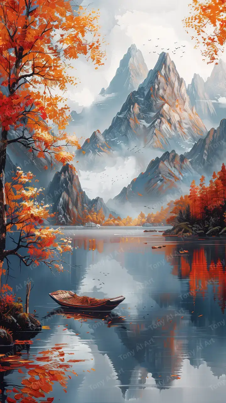 Hình nền phong cảnh sơn thủy mùa thu, thuyền cứu tinh trên hồ nước yên bình, hiệu ứng sương mù huyền ảo 4K.