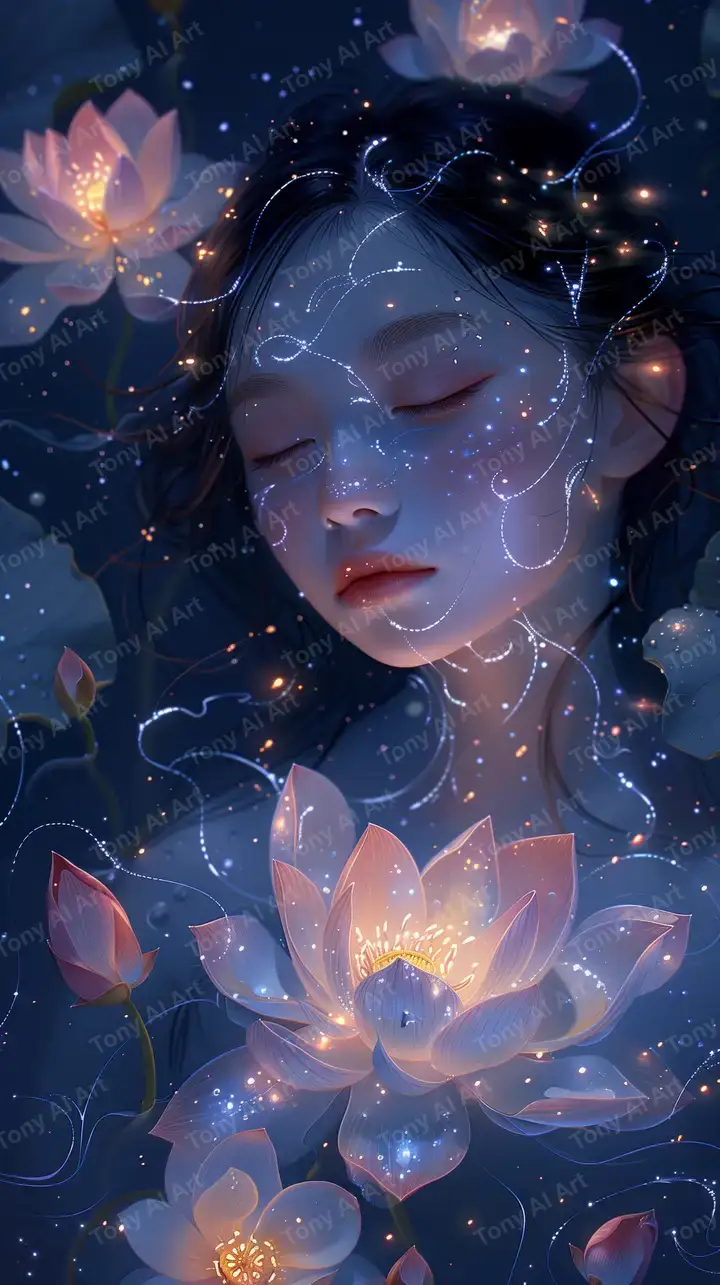 Hình nền hoa sen neon cosmic với chân dung nữ tỏa sáng, hiệu ứng galaxy vàng cam, phù hợp phong thủy hiện đại, tải 4K miễn phí.