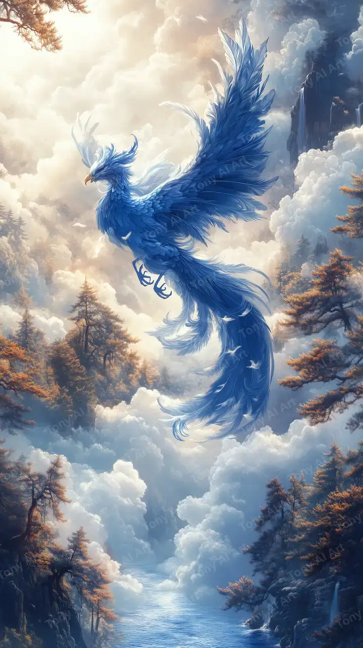 Hình nền phượng hoàng xanh da trời huyền thoại, bối cảnh mây trắng và rừng cây, hiệu ứng ánh sáng kỳ ảo, tải miễn phí 4K.