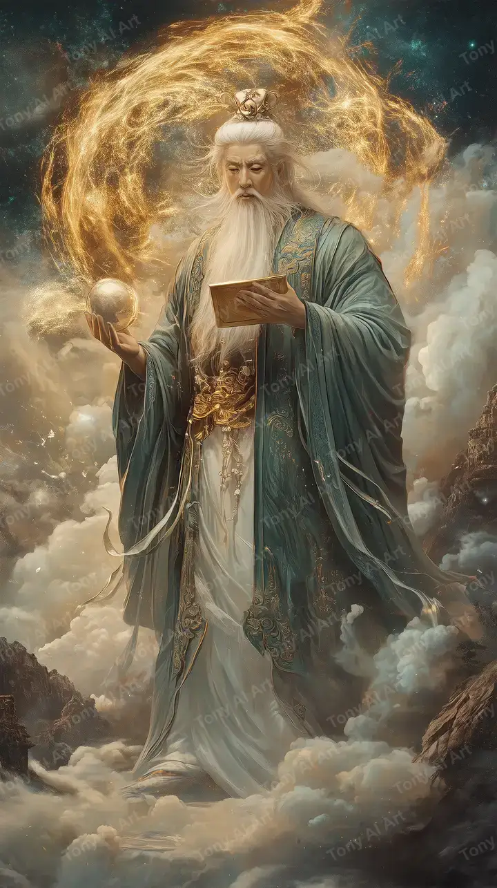 Hình nền thần tiên phong thủy AI art, ông lão cầm sách vàng với halo neon cosmic, hiệu ứng ethereal, tải 4K miễn phí.