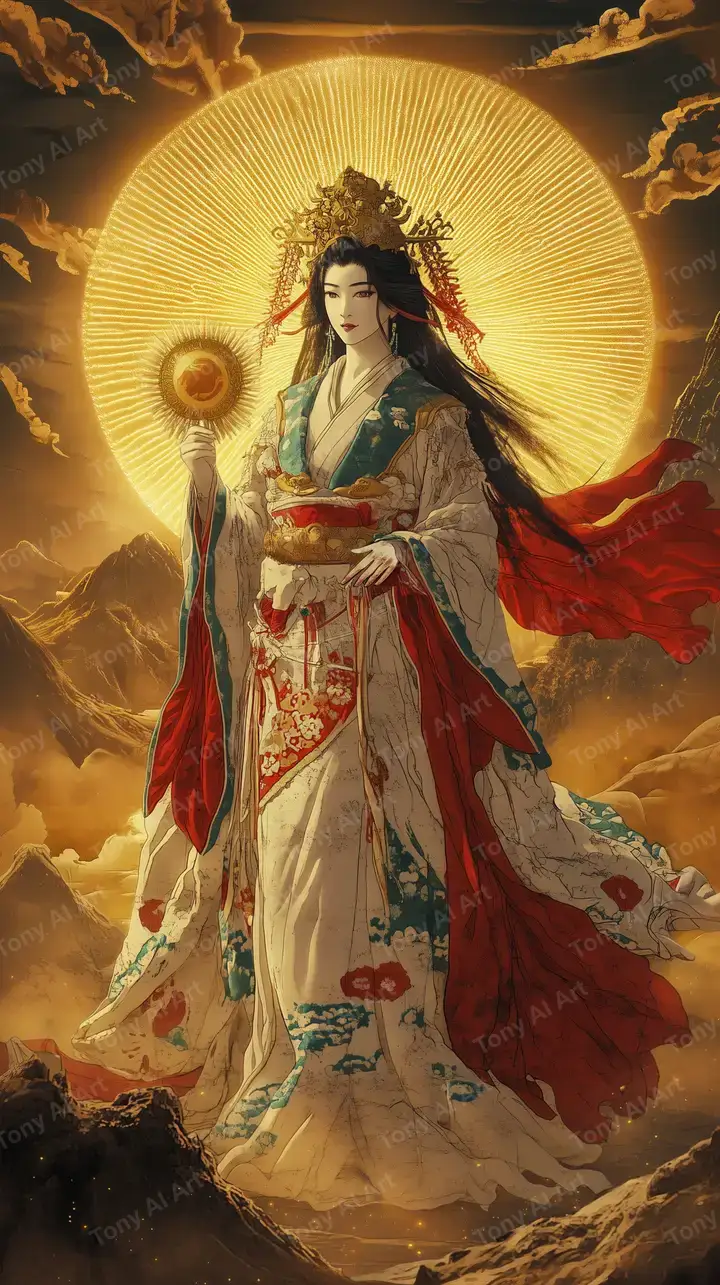 Hình nền AI art nữ thần vàng với hào quang thiêng liêng, trang phục cổ Á Đông, hiệu ứng ánh sáng ma thuật, tải miễn phí 4K.
