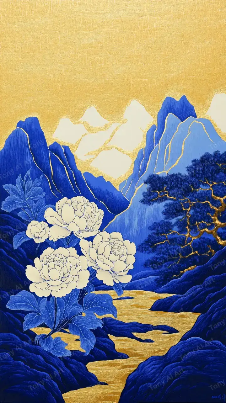 Hình nền AI art phong cách Truyền Thống Châu Á: núi xanh lam, hoa mẫu đơn trắng, đường vàng lung linh. Tải miễn phí 4K HD.