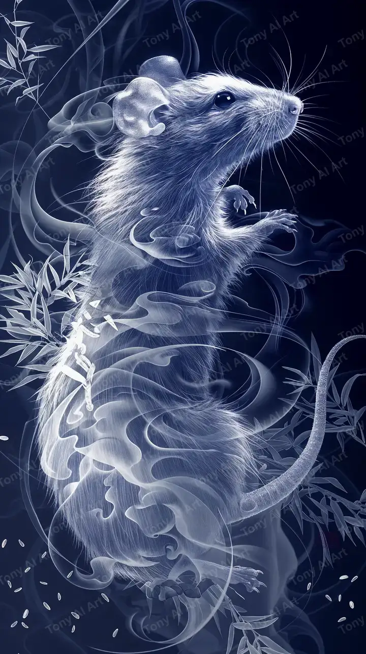 Hình nền chuột bạc phong thủy AI art, hiệu ứng neon ethereal, bối cảnh lá cây cosmic, tải miễn phí 4K.