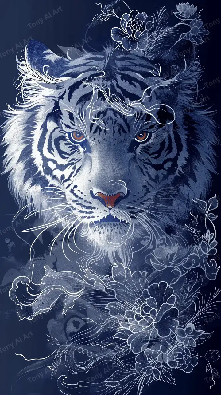 Hình nền hổ xanh navy phong thủy AI art, tỏa sáng neon tinh tế, tải miễn phí 4K.