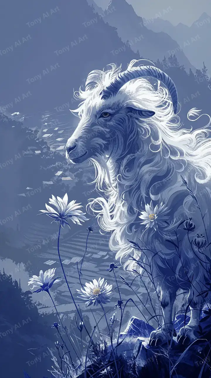 Hình nền dê trắng tâm linh phong thủy AI art, núi cao thiên nhiên, hoa sen, hiệu ứng neon glow mềm, tải miễn phí 4K.