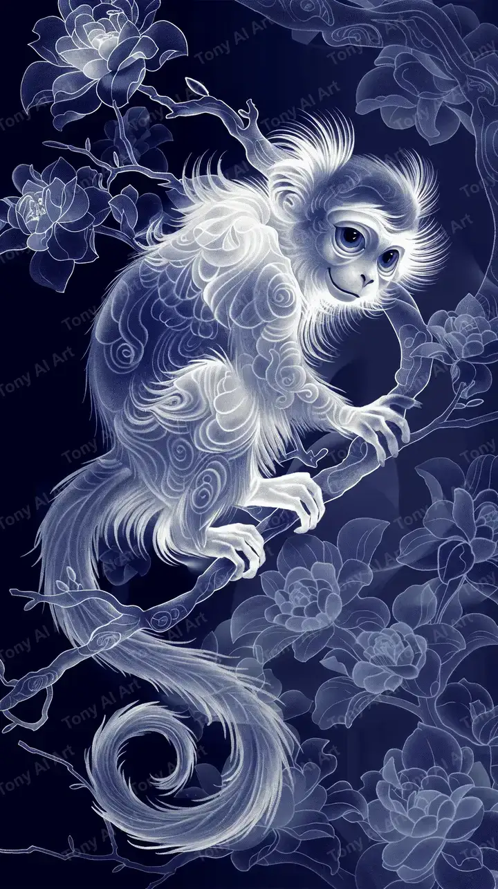 Hình nền AI art khỉ tinh với hiệu ứng ánh sáng cosmic, hoa mẫu đơn xanh trắng, phong cách luminous line art, tải miễn phí 4K.
