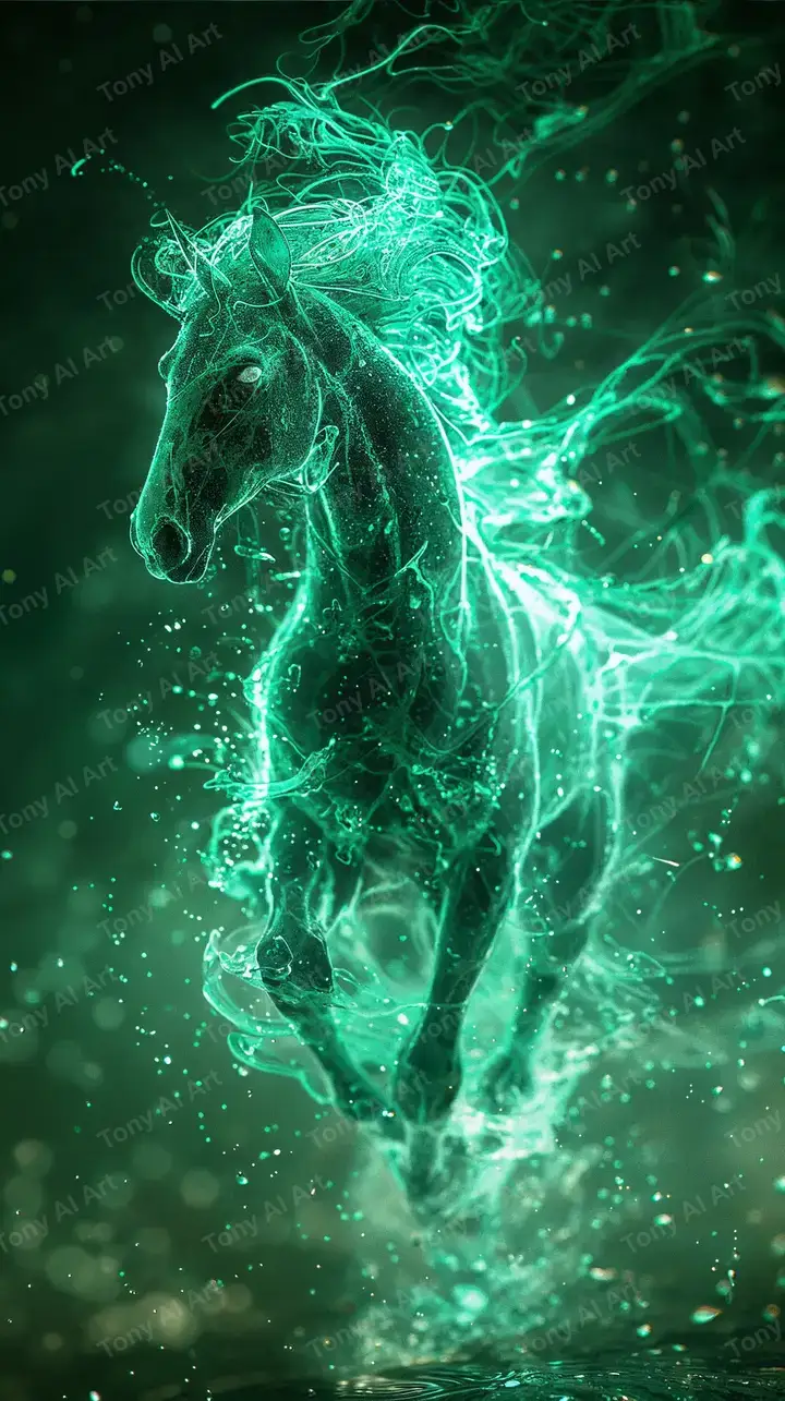 Hình nền ngựa neon xanh lục phong thủy với hiệu ứng cosmic glow, tải miễn phí 4K HD.