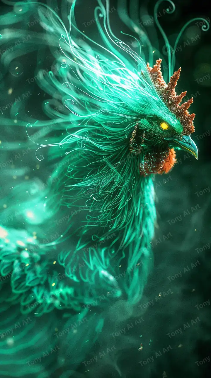 Hình nền phượng hoàng xanh ngọc với hiệu ứng neon cosmic, lông vũ phát sáng, tải miễn phí 4K HD.