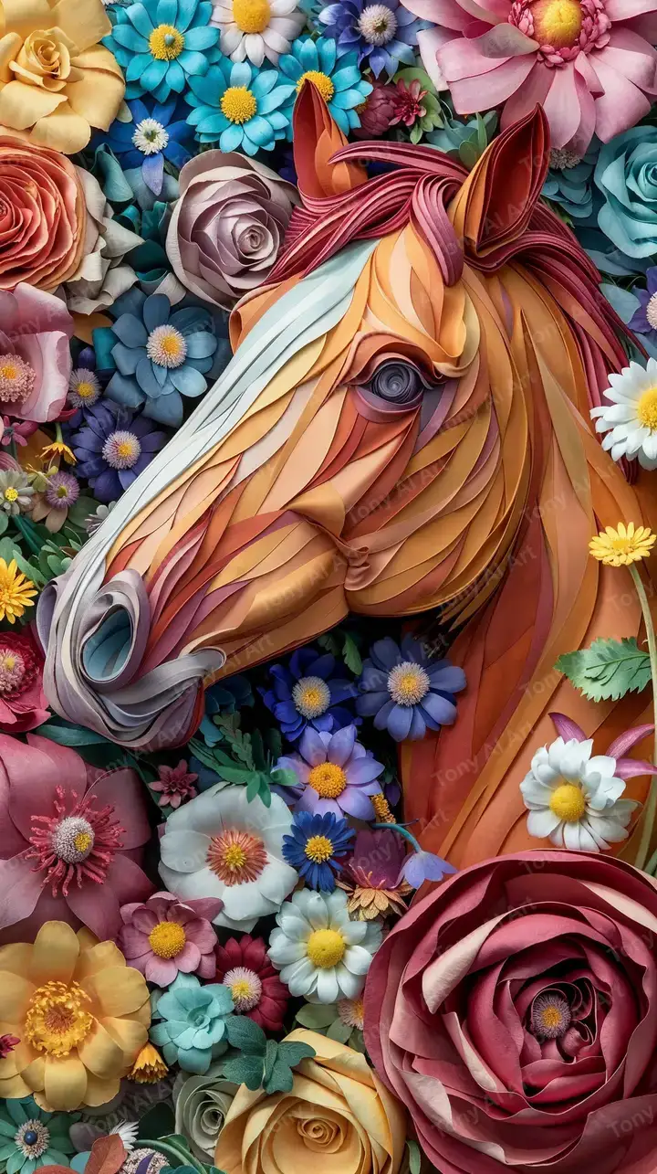 Hình nền AI art mã vàng cam giữa vườn hoa đa sắc, hiệu ứng 3D nổi bật, tải miễn phí 4K.