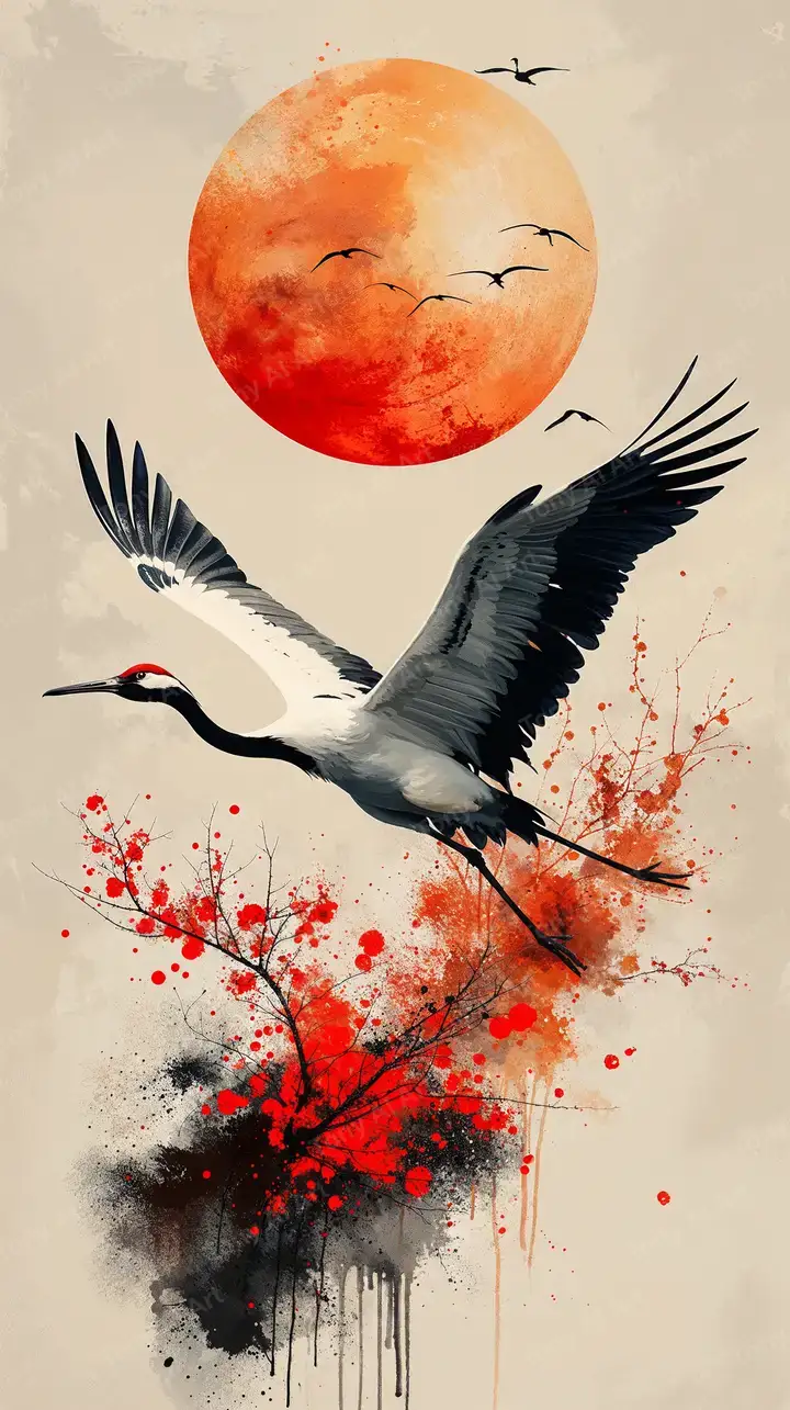 300 DPIChim Hạc Bay Lên Mặt Trời Đỏ - Hình Nền AI Art 4K