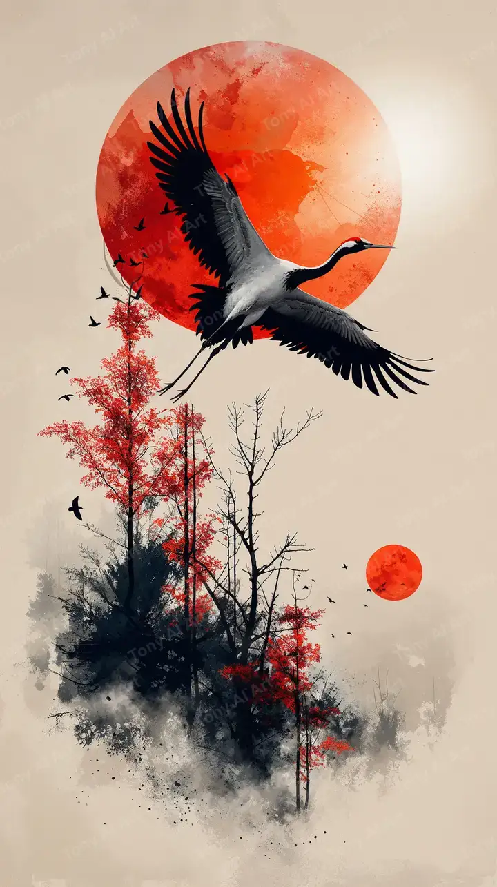 300 DPIHạc Bay Mặt Trời Đỏ - Hình Nền AI Art Watercolor 4K