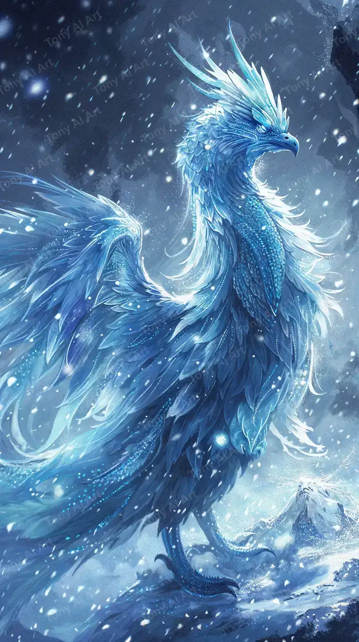 Phượng hoàng xanh neon cosmic với hiệu ứng ánh sáng kỳ ảo, bối cảnh tuyết lạnh, AI art chất lượng 4K tải miễn phí.
