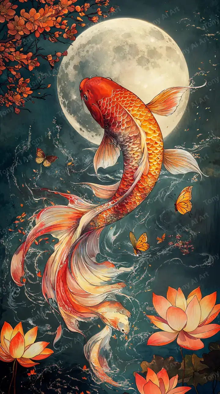 Hình nền cá koi phong thủy AI art 4K, neon cosmic effects, hoa sen may mắn, tải miễn phí.