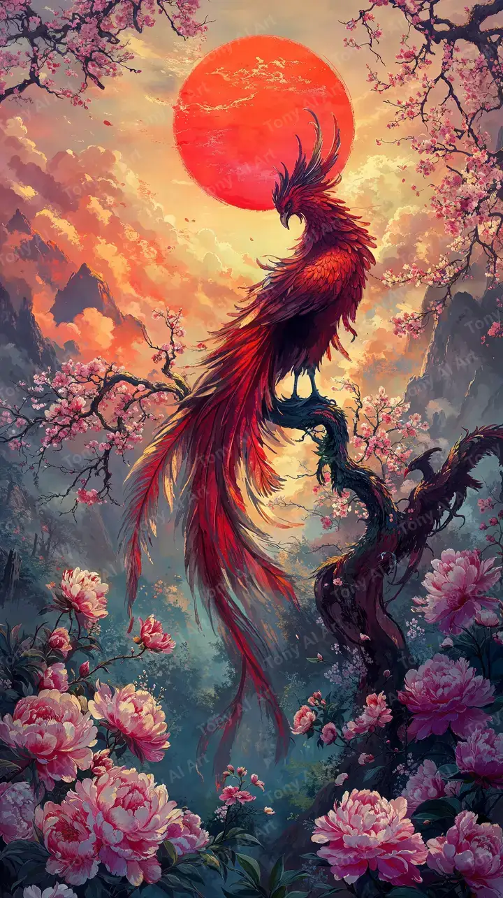 Hình nền AI art rồng phượng lửa với cánh hoa mẫu đơn, ánh sáng neon cosmic, phong cách phong thủy Châu Á, 4K tải miễn phí.