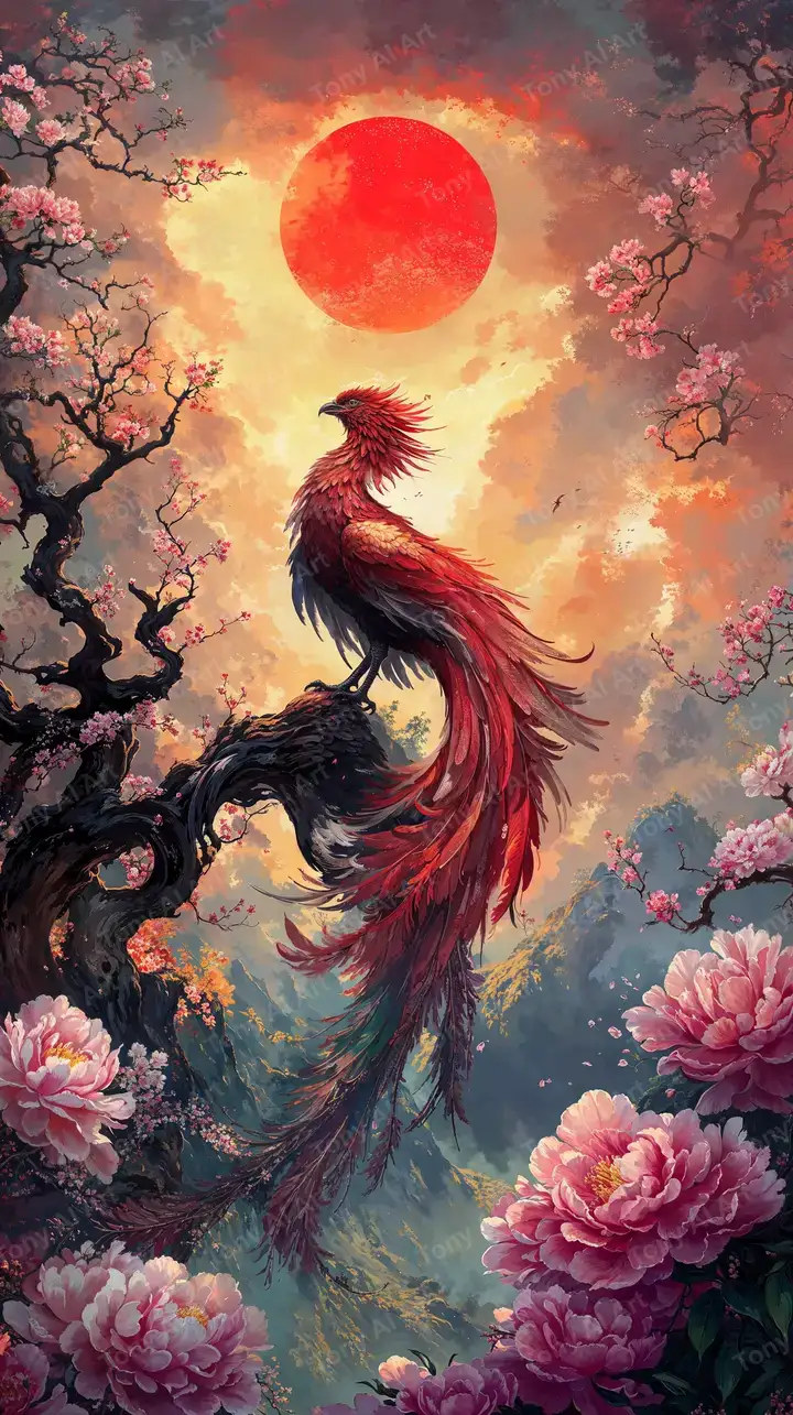 Hình nền phượng hoàng phong thủy AI art, hoa mẫu đơn hồng đậm, ánh sáng ấm cosmic, tải miễn phí 4K.