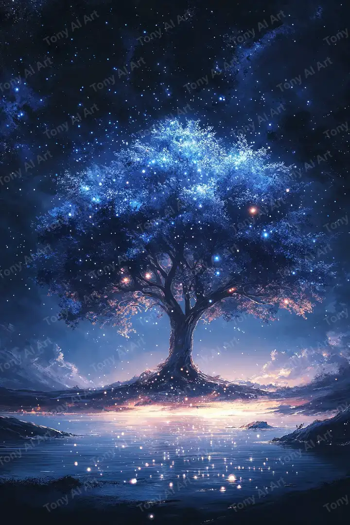 Hình nền cây sao với hiệu ứng neon cosmic, phong thủy đẹp, AI art tải miễn phí 4K độ phân giải cao.