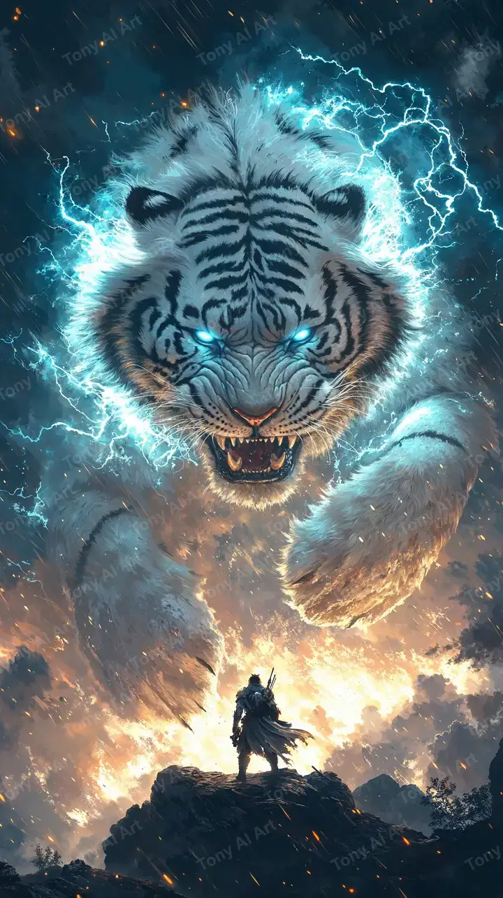 Hình nền hổ trắng sét vàng AI art, hiệu ứng neon cosmic và chiến binh anh hùng, tải miễn phí 4K.