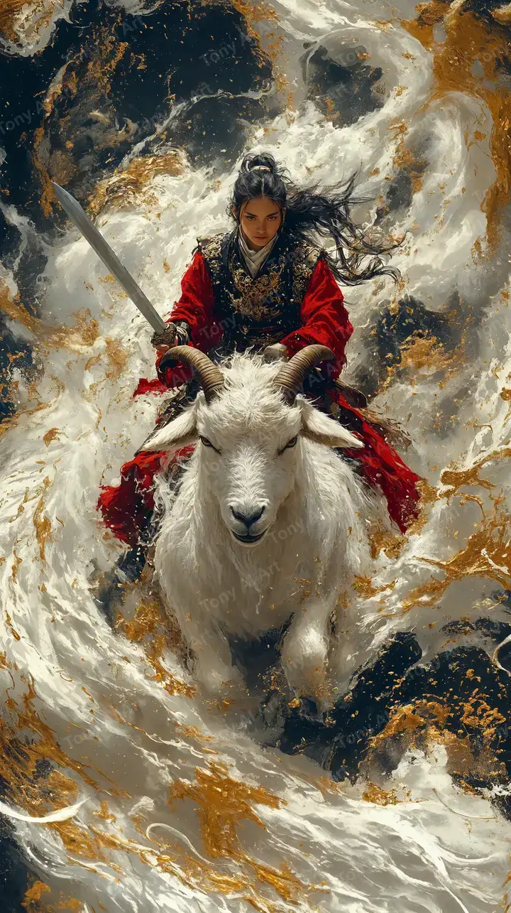 Hình nền AI art cô gái cưỡi dê trắng, hiệu ứng cosmic vàng đồng, tâm linh phong thủy, tải 4K miễn phí.