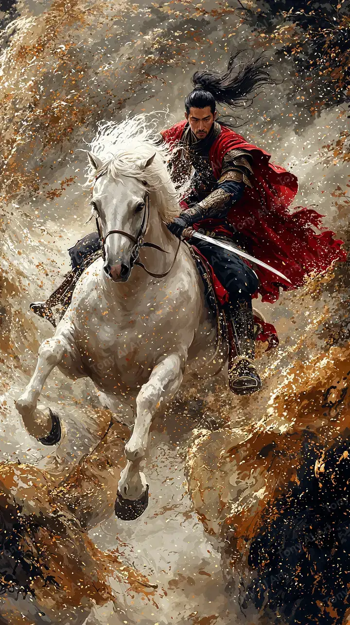 Hình nền AI art hiệp sĩ mặc áo đỏ cưỡi ngựa trắng, hiệu ứng vàng cosmic tuyệt đẹp, phong cách fantasy hùng tráng. Tải miễn phí 4K.