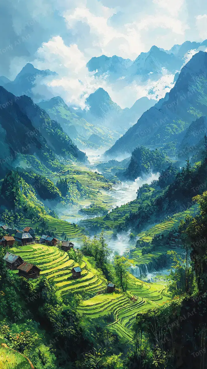 Hình nền thung lũng núi xanh ngọc bích, ruộng bậc thang sương mù AI art, cảnh tượng yên bình hùng vĩ 4K.