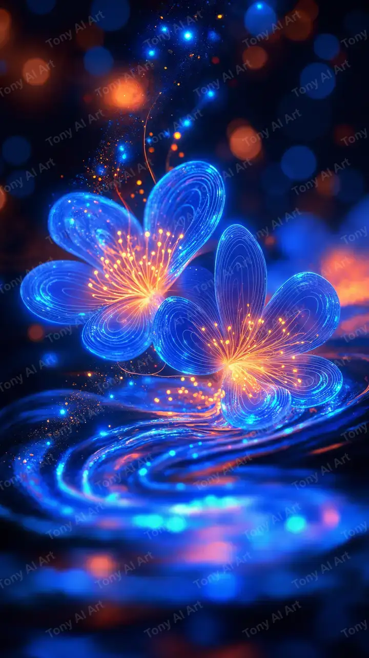 Hình nền hoa neon cosmic AI art, hiệu ứng luminous glow, gradient xanh cam đầy năng lượng, tải miễn phí 4K.