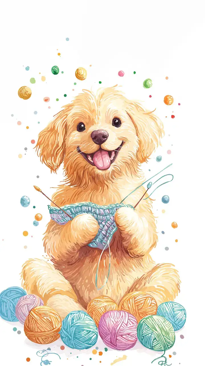 Hình nền chó vàng dễ thương với hiệu ứng watercolor, quả bóng len sáng tạo, tải miễn phí 4K.