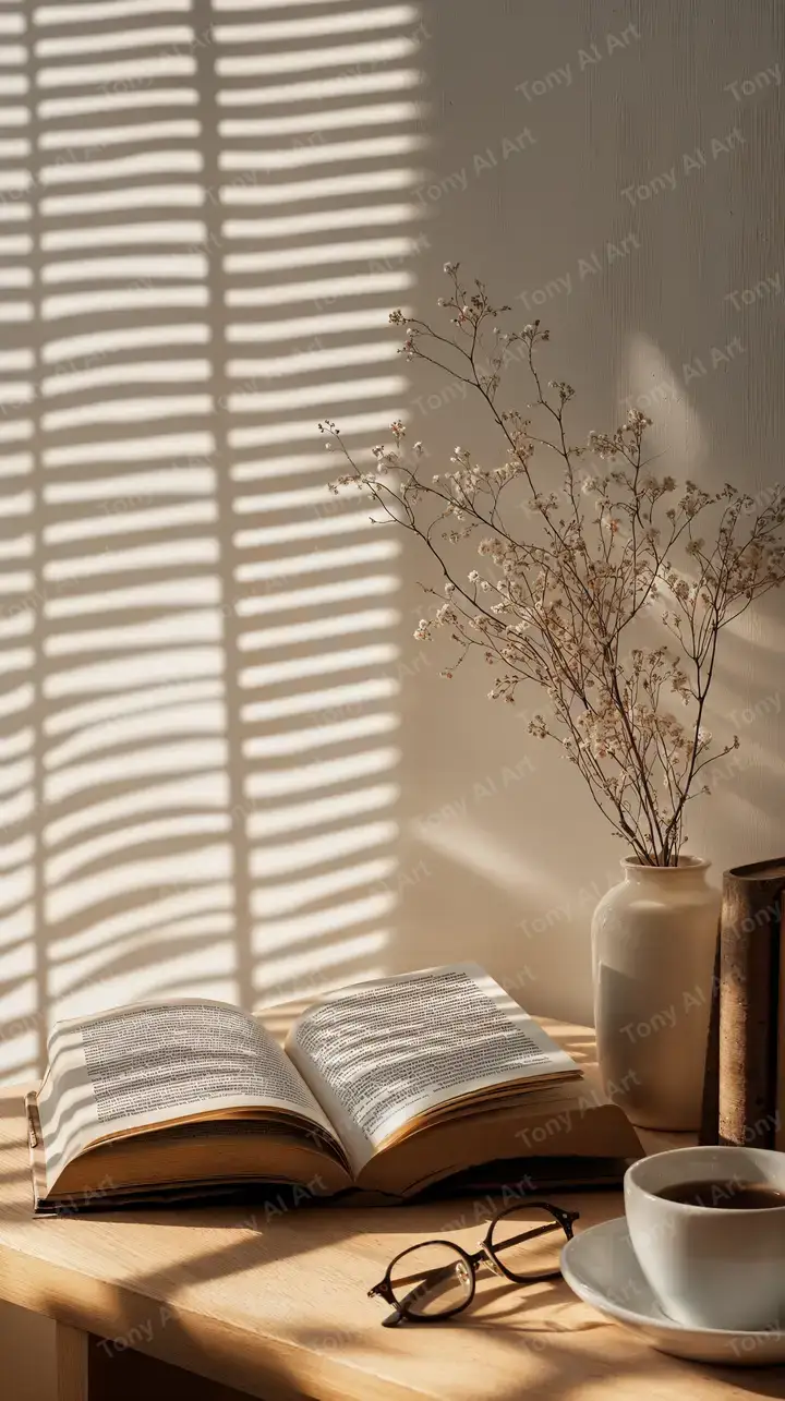 Hình nền minimalist với sách mở, cốc cà phê, bình hoa khô. Ánh sáng tự nhiên mềm mại, bóng cửa sổ thanh ngang. Tải 4K miễn phí cho desktop.