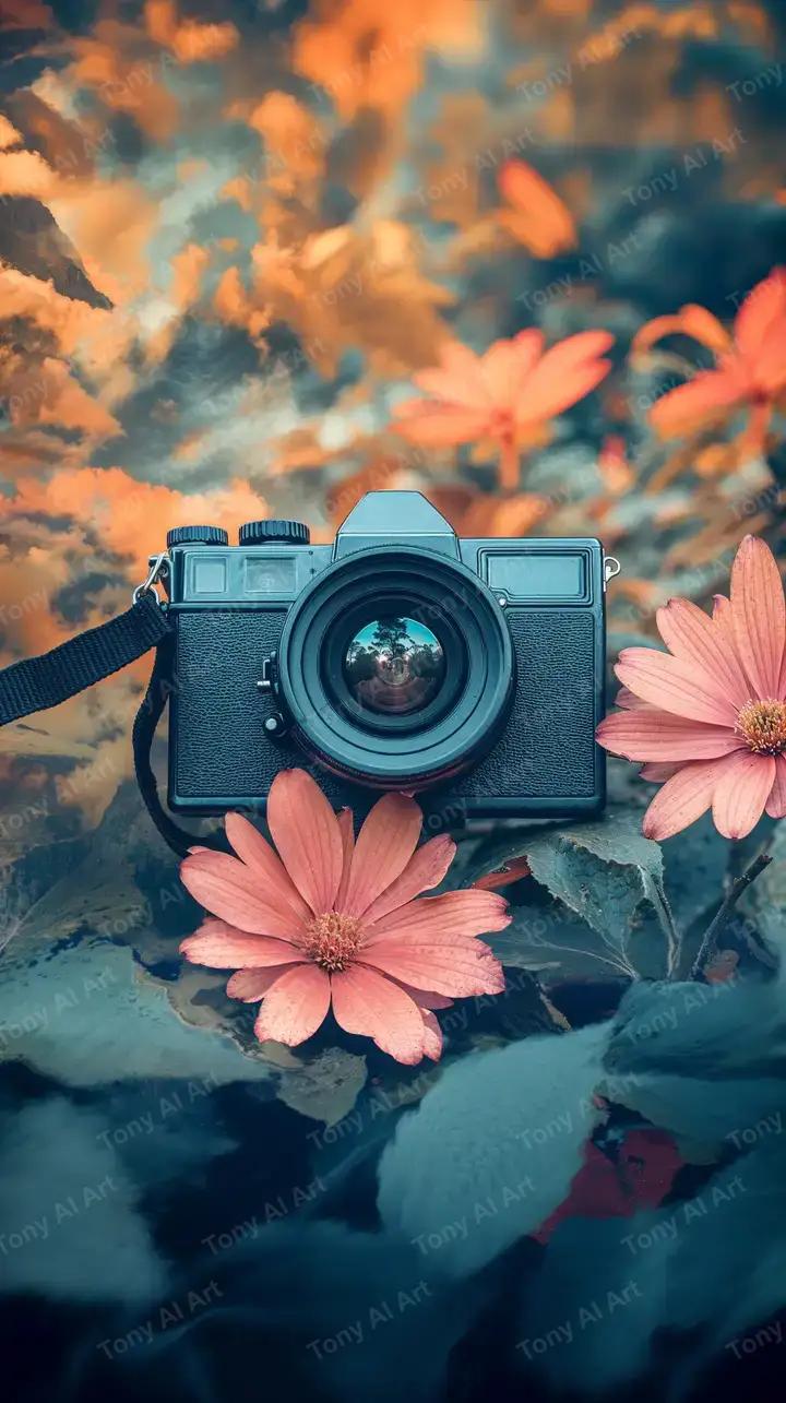 Hình nền máy ảnh retro xanh lam giữa hoa hồng, gradient bầu trời cam-xanh, hiệu ứng depth of field, tải miễn phí 4K AI art.