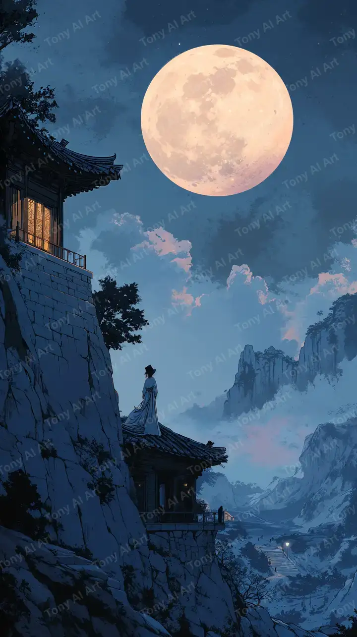 300 DPIMặt Trăng Đêm Thung Lũng Núi - Hình Nền AI Art Phong Thủy 4K