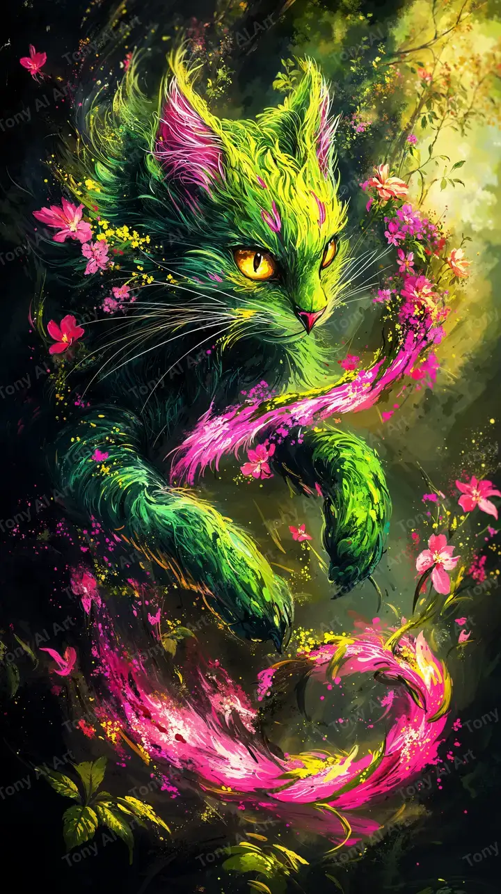 300 DPIMèo Neon Xanh Lá - Hình Nền AI Art Cosmic 4K