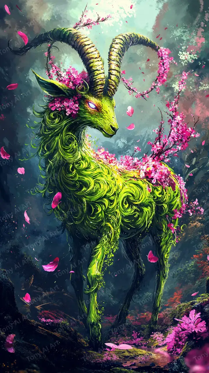 Hình nền AI art con dê phép thuật với hiệu ứng neon xanh lá, hoa hồng bay, atmosphere huyền bí, tải miễn phí 4K.