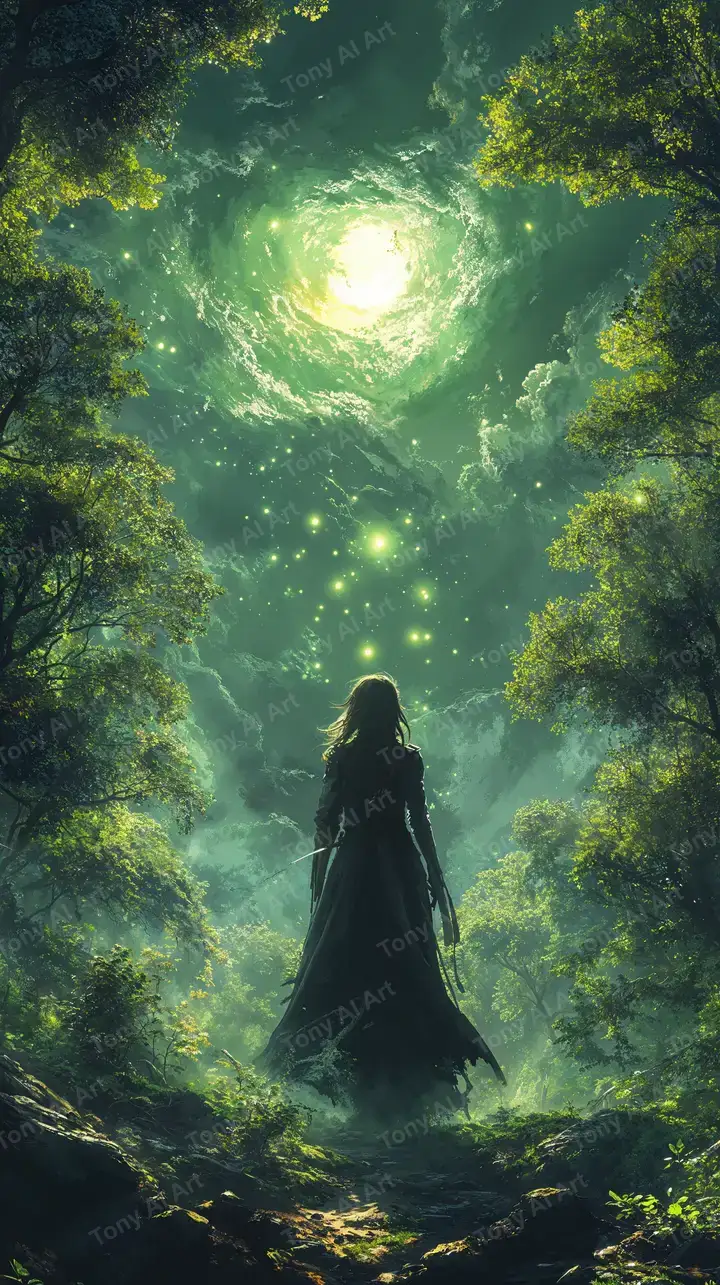 Hình nền cô gái phù thủy rừng hoang dã với hiệu ứng ánh sáng ma thuật 4K, không chứa hạn chế.