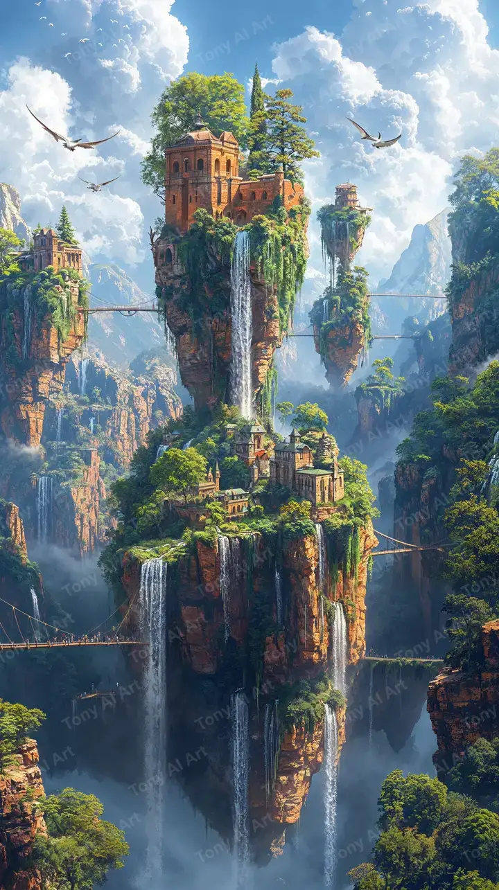 Hình nền đảo nổi AI art với tòa tháp cổ, thác nước hư ảo, bầu trời mây xanh, phong cảnh phong thủy 4K tải miễn phí.
