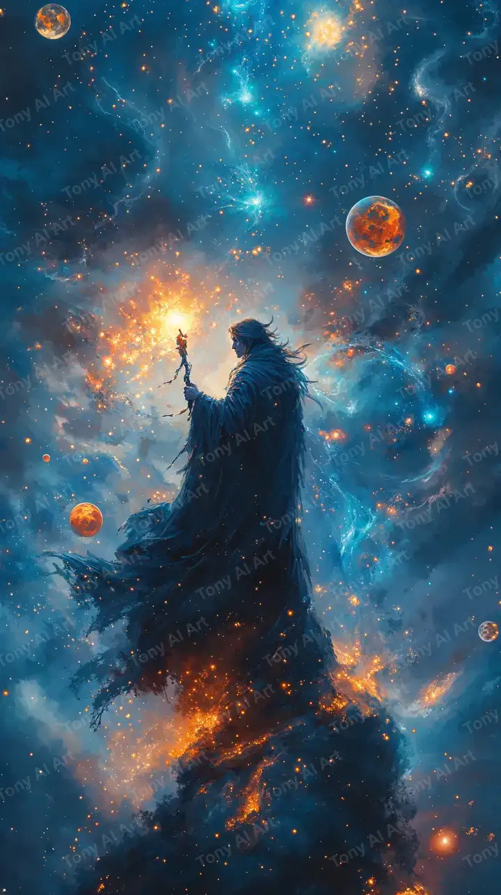 Hình nền AI art pháp sư cầm lửa vũ trụ, hiệu ứng cosmic neon xanh cam, ánh sáng hành tinh, tải 4K miễn phí.