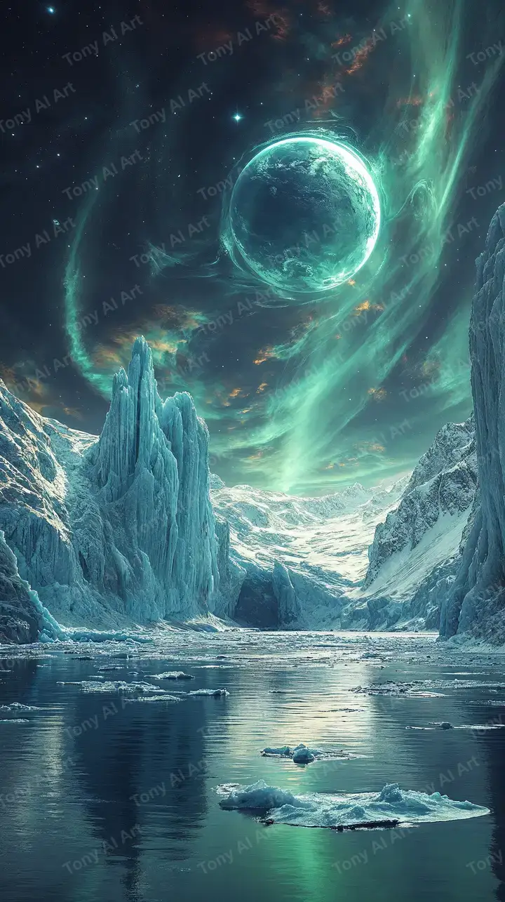 Hình nền hành tinh xanh lá AI art với bắc cực quang rực rỡ, núi tuyết cao vút, tải miễn phí 4K đầy ma mị và huyền bí.