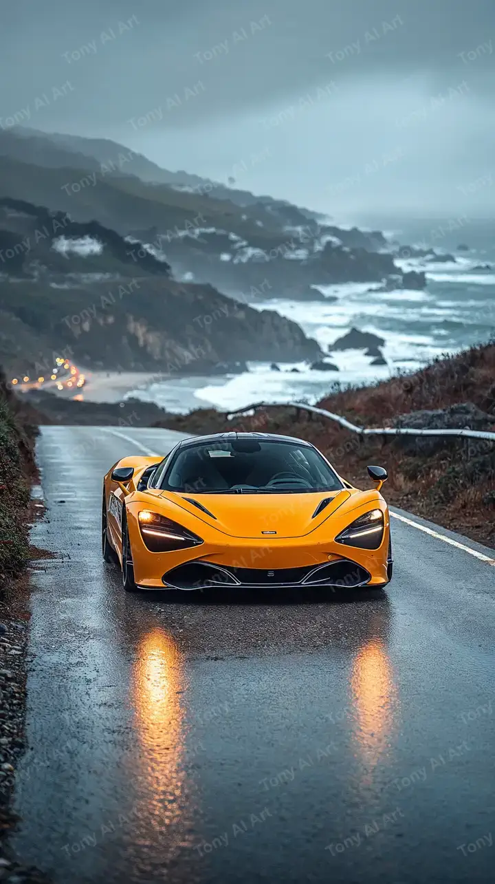 Hình nền xe thể thao McLaren vàng kim trên đường ướt, nền biển Địa Trung Hải, hiệu ứng mưa cinematic, tải 4K.