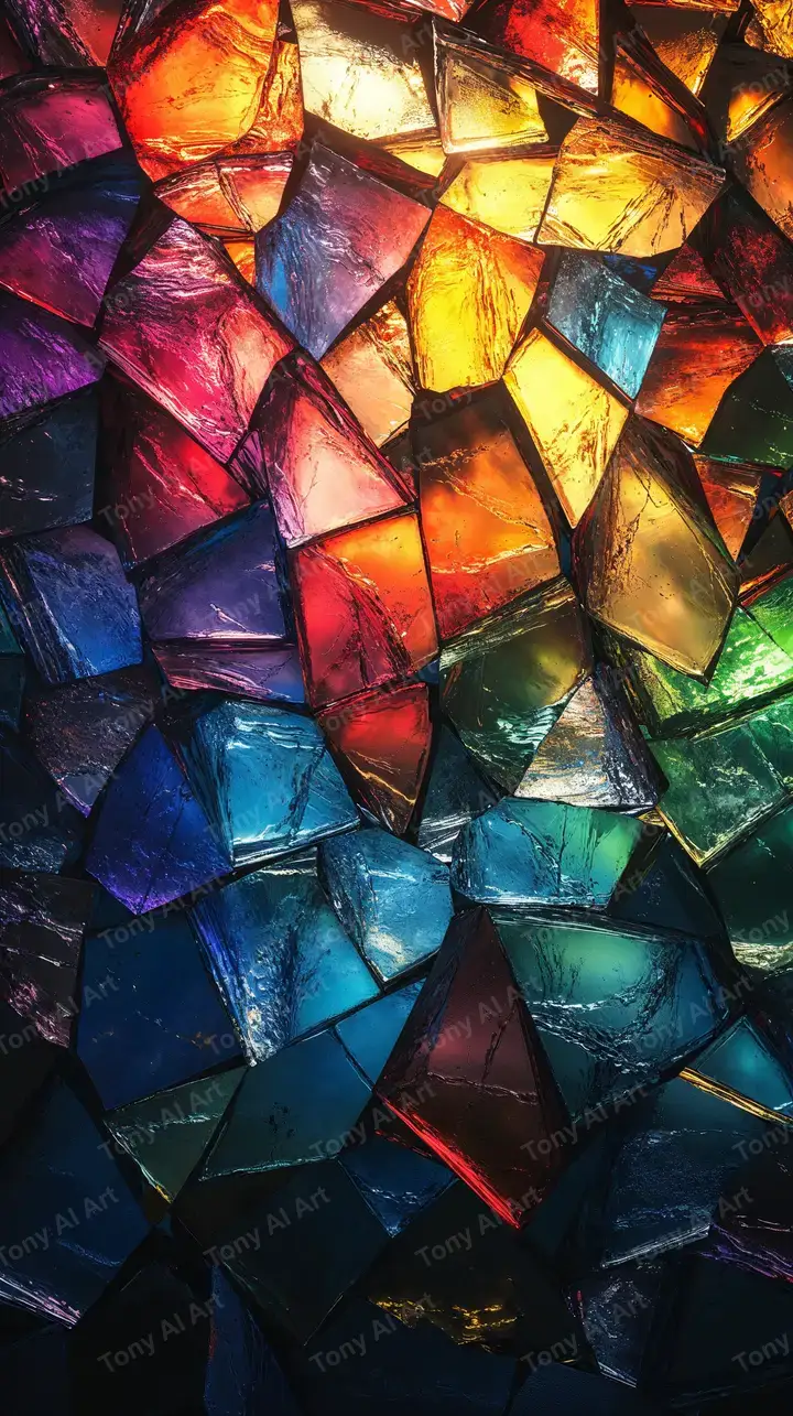 Hình nền tinh thể neon gradient sôi động với hiệu ứng glow 3D, tone màu xanh-tím-vàng, AI art tải miễn phí 4K.