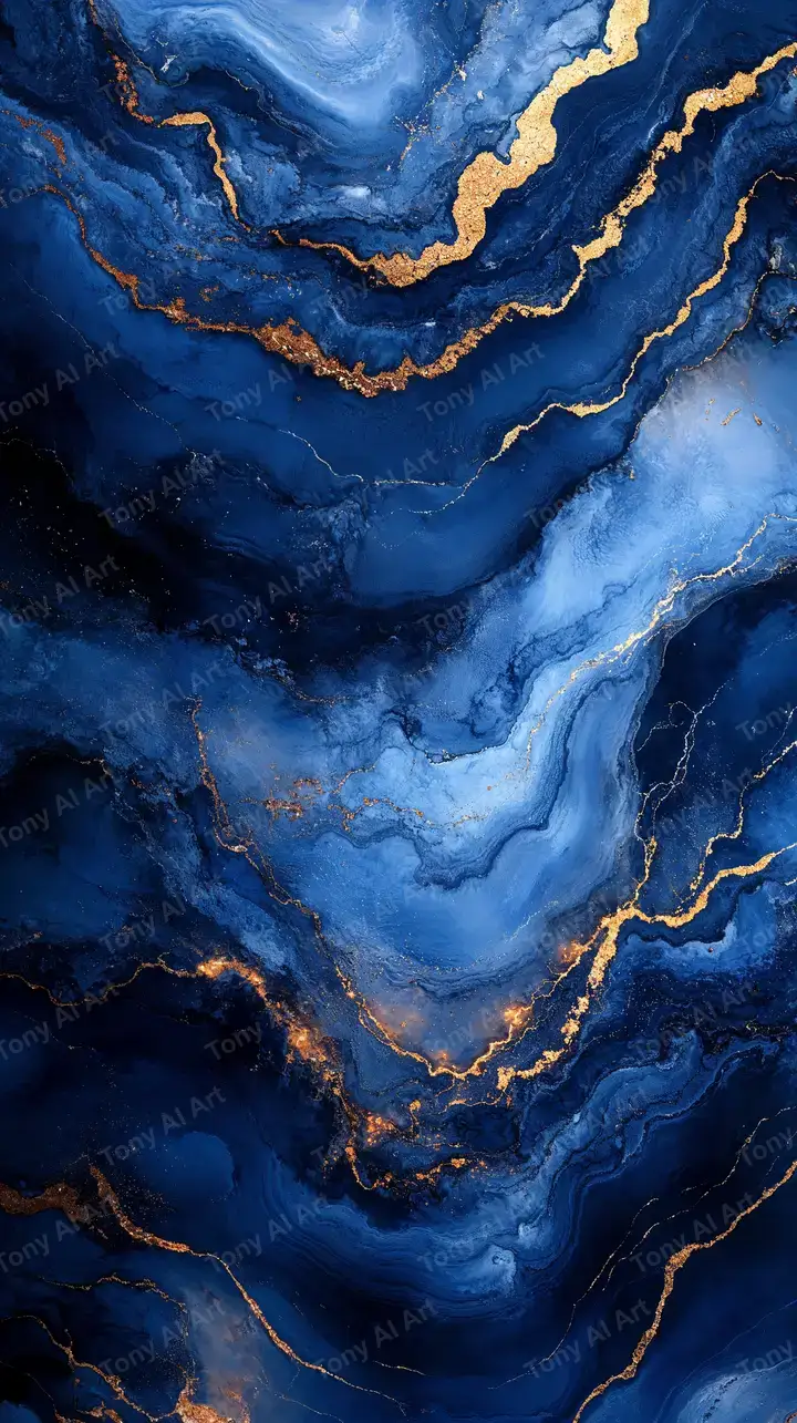 Hình nền AI art trừu tượng với gradient xanh dương sâu, vân vàng sang trọng, hiệu ứng liquid cosmic, tải 4K miễn phí.