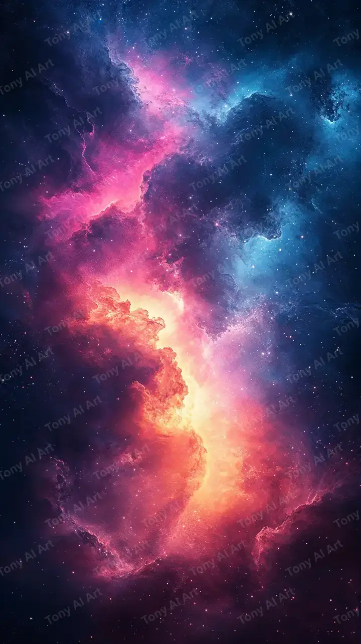Hình nền tinh vân cosmic với gradient hồng vàng xanh, hiệu ứng cosmic rays và particles, tải miễn phí 4K.