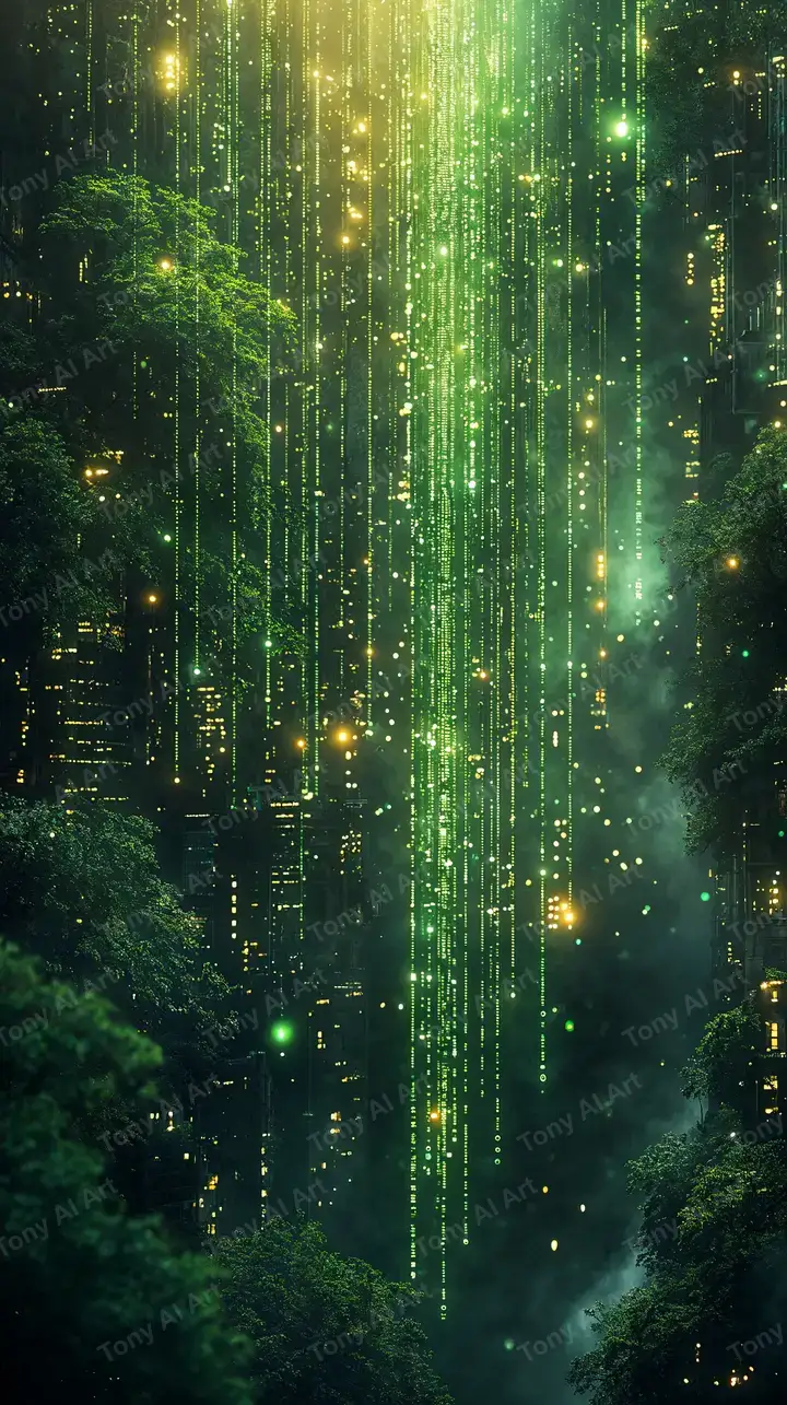 Hình nền rừng xanh công nghệ AI art, phối hợp neon vàng, digital rain effect, tải miễn phí 4K.
