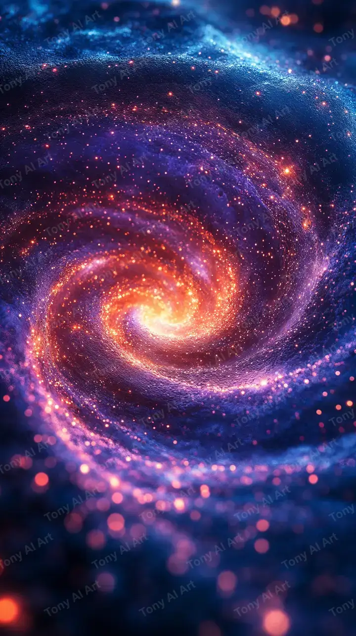 Hình nền thiên hà xoắn ốc cosmic với neon glow, hạt sáng điện xanh cam, AI art tải miễn phí 4K.