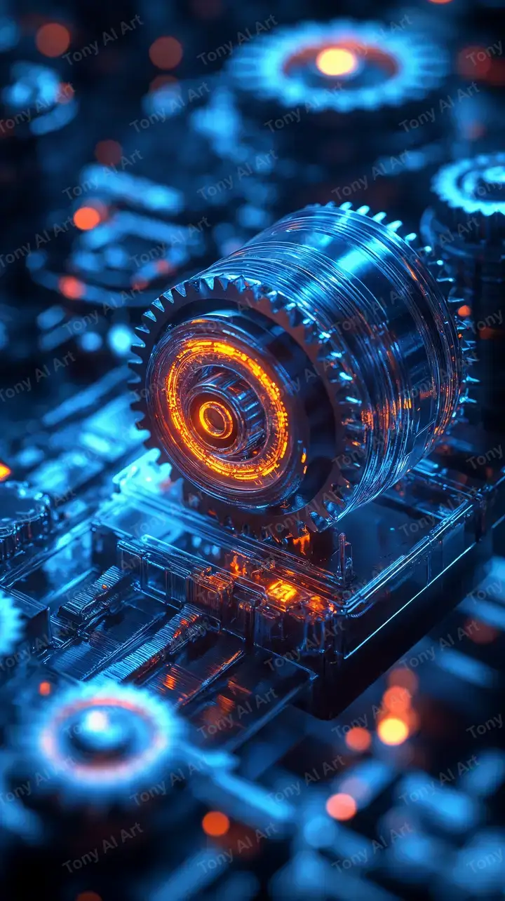 Hình nền bánh xe neon cam sáng trên circuit board xanh lam, AI art công nghệ, hiệu ứng glow cyberpunk, tải miễn phí 4K HD.