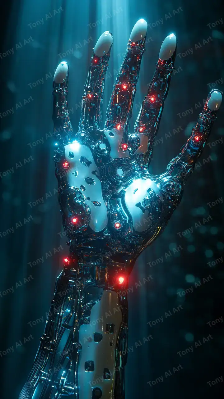 Hình nền bàn tay robot neon cyberpunk, hiệu ứng LED sáng, background cosmic xanh teal, tải miễn phí 4K.