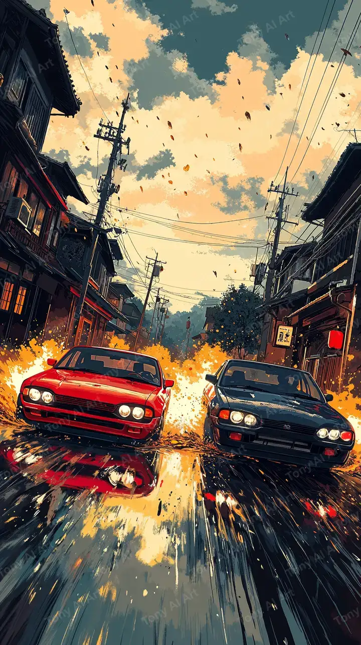 Hình nền xe cổ neon phố Việt cũ AI art, hiệu ứng lửa sống động, anime style, tải 4K miễn phí.