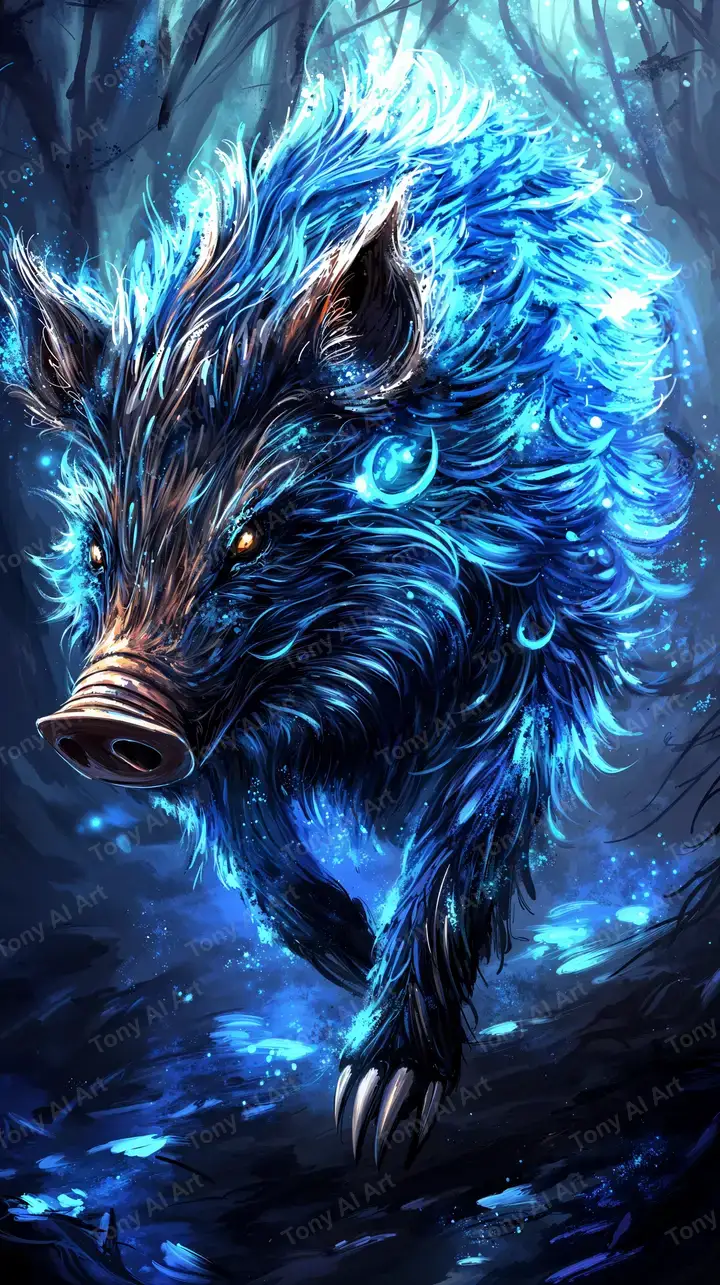 Hình nền lợn cosmic với hiệu ứng neon xanh dương, mắt sáng vàng và năng lượng điện tử. AI art 4K miễn phí cho desktop & mobile.
