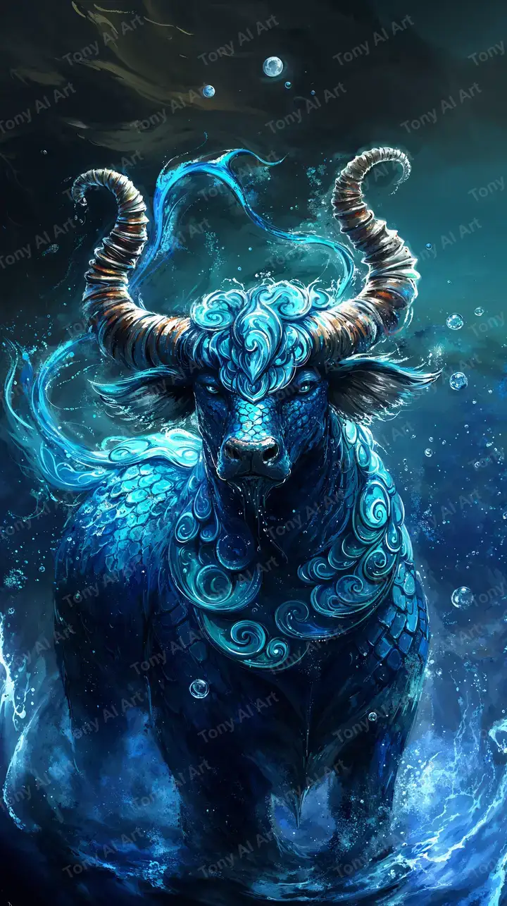 Hình nền trâu neon AI art phong cách cosmic fantasy, sừng dài trang trí, hiệu ứng neon cyan glow đặc biệt, tải miễn phí 4K.