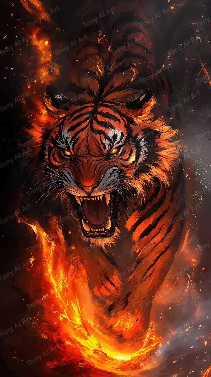 Hình nền hổ lửa cosmos AI art, hiệu ứng flame glow mạnh mẽ, chủ đề fantasy cosmic, tải 4K miễn phí.