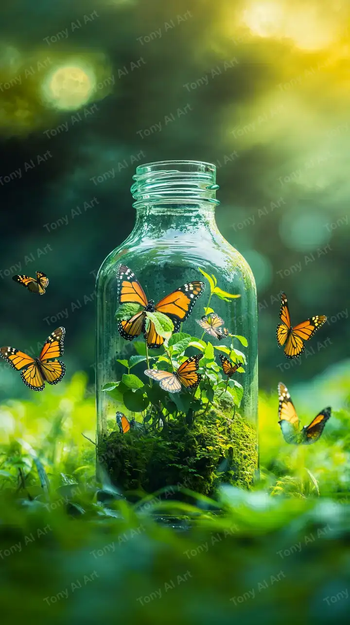 Hình nền thiên nhiên AI art với bướm vàng, chai thủy tinh xanh, hiệu ứng bokeh mộng mơ, tải miễn phí 4K.